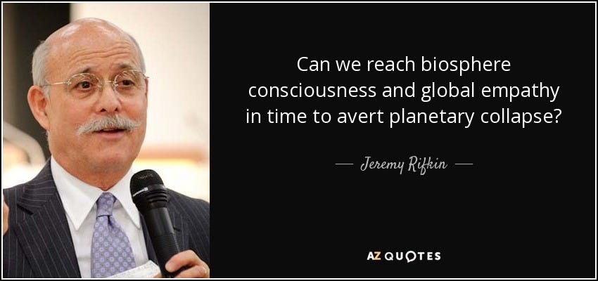 “The Empathic Civilization is emerging. A younger generation is fast extending its empathic embrace beyond religious affiliations and national identification to include the whole of humanity and the vast project of life that envelops the Earth.” Jeremy Rifkin1